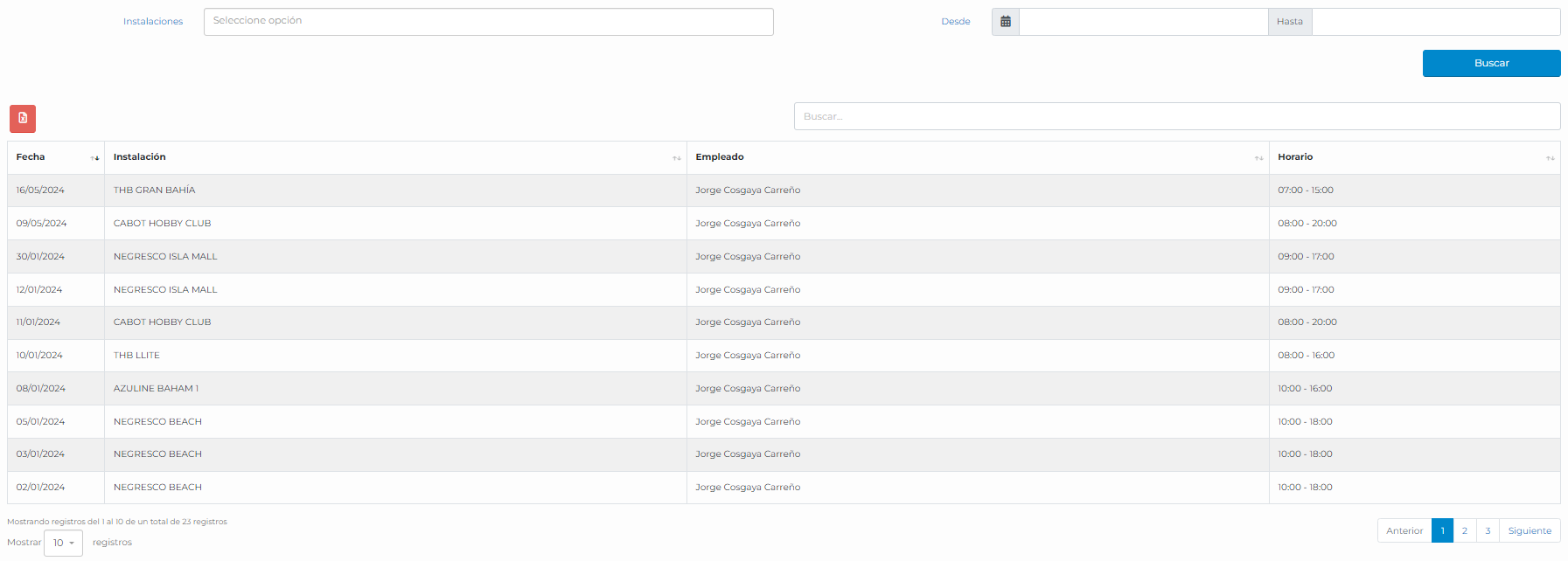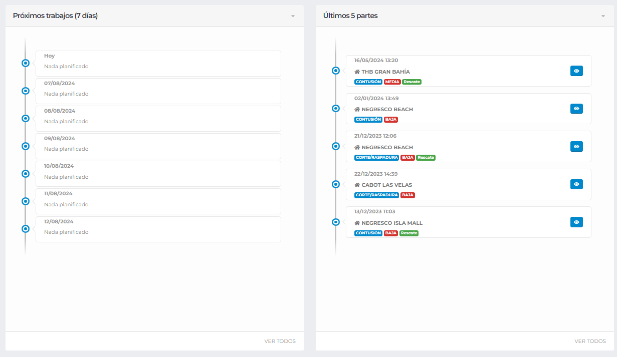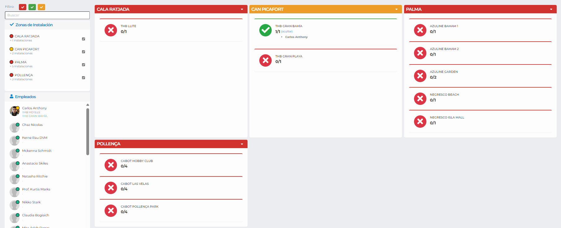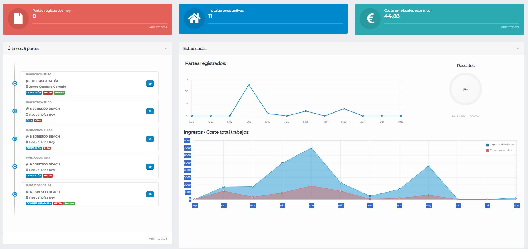 3. Un panel de control para los empleados, donde puede comprobar las instalaciones asignadas y otros datos de interés para la gestión de las jornadas, así como un punto de registro de las incidencias o parte de actuaciones registradas en las instalaciones.