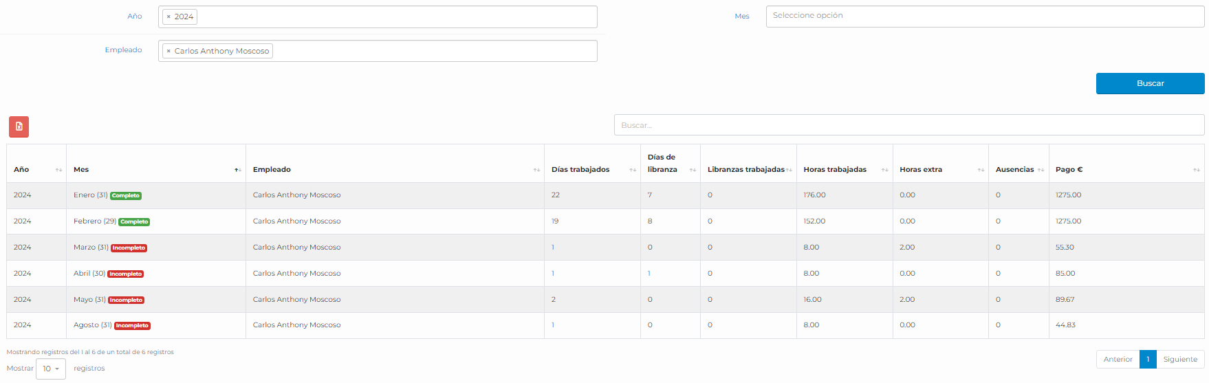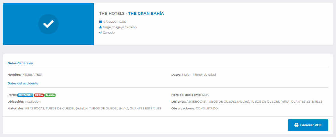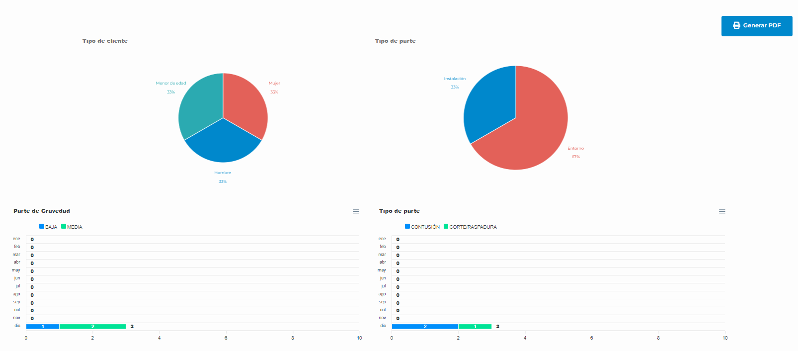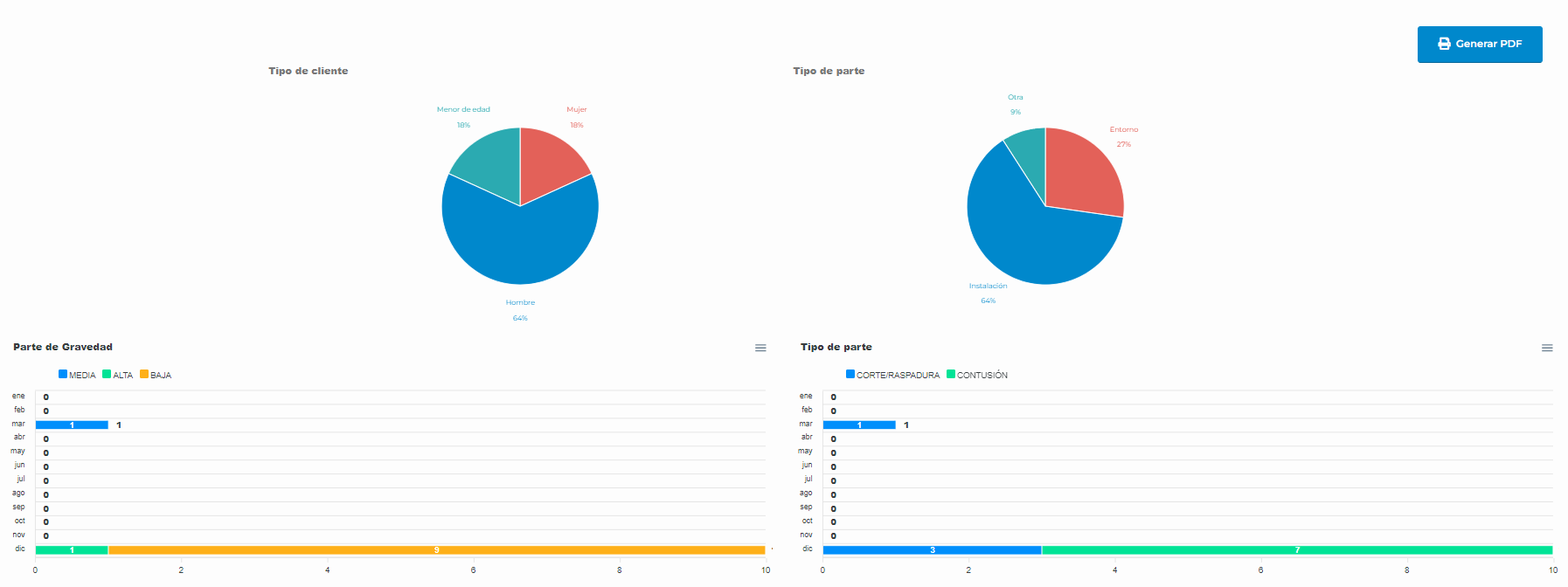 De cara a la gestión posterior de la información registrada se han creado paneles estadísticos, tanto para el acceso de cliente como para el acceso de la administración, donde se puede consultar toda la información y exportarla en formato PDF.